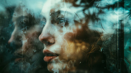 Close up portrait of a young woman featuring double exposure with glitch art elements