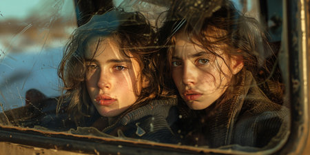 Two young women sitting in a car, gazing out the window, lost in contemplation and wonderment.