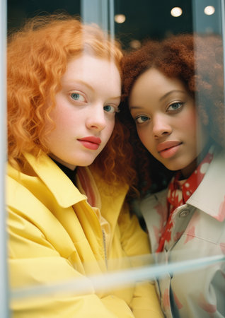 Portraite of two friends, one plus-size and the other of a different skin color, window-shopping together, capturing their reflections and skin blemishes