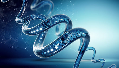 A digital representation of a DNA helix in blue light, symbolizing genetic research and technological advancement.
