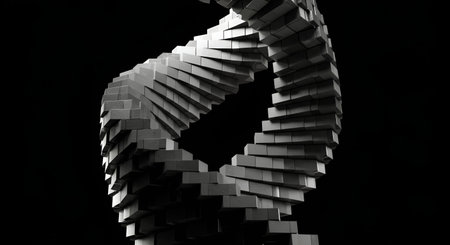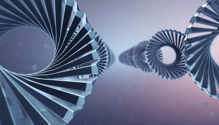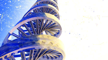Luminous DNA strands intertwine to form a surreal spiral staircase in this captivating 3D render The clean minimal aesthetic emphasizes the inherent elegance of the genetic helix structure