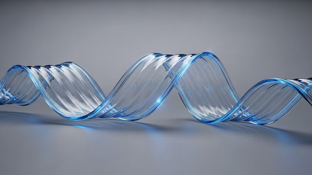 A transparent blue ribbon twists and flows with bright edge lighting, creating a dynamic shape on a gray surface.