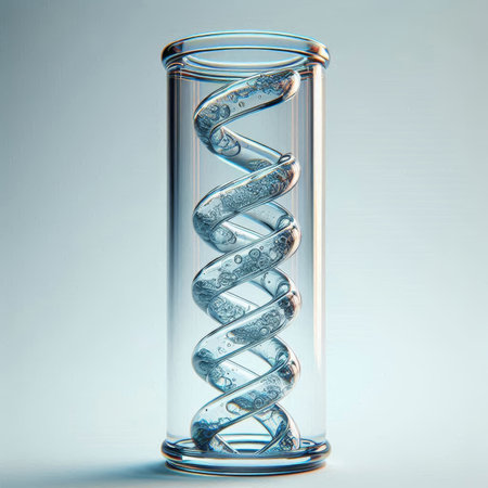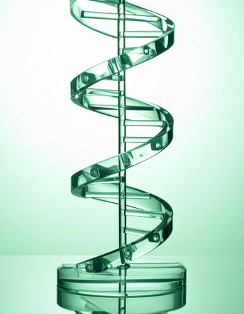 A pristine glass model of a DNA double helix stands against a clean, green-tinted background.