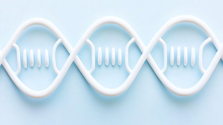 A minimalist, stylized white DNA model is centered on a light blue background, representing genetics, biology, and scientific research with a clean, modern aesthetic.