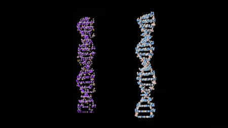A 3D rendered DNA double helix with orange and blue colors on a dark blue background.