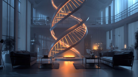 This image showcases an artistic interior featuring a unique spiraling DNA structure as the centerpiece, surrounded by modern furniture and a cozy atmosphere.