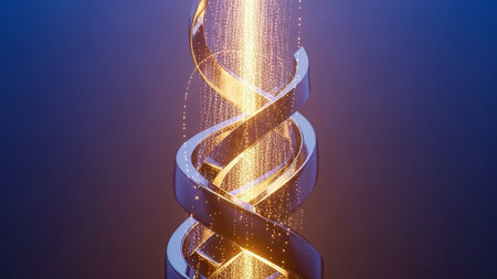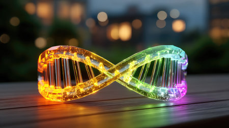 Intricate glass sculpture of a double helix, highlighted by delicate reflections, set against a vibrant, softly blurred background of shimmering bokeh lights.