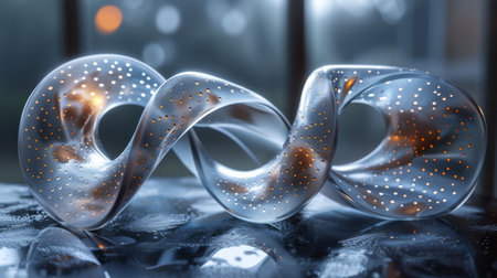 An infinity symbol made of colorful transparent twisted material glows with light and reflections in a room.
