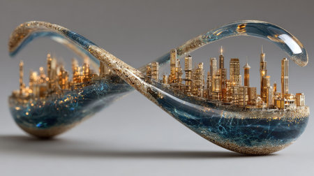 This stunning infinity symbol sculpture showcases a detailed miniature cityscape illuminated with warm lights, creating a captivating visual experience.