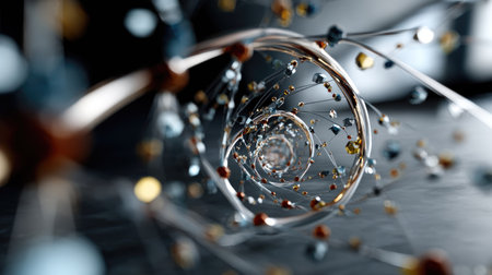This dynamic abstract image showcases a swirling molecular structure filled with colorful particles, emphasizing energy and motion in a futuristic setting.