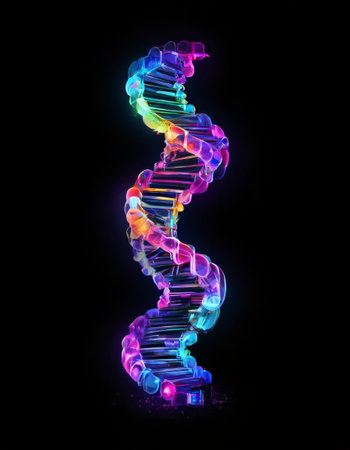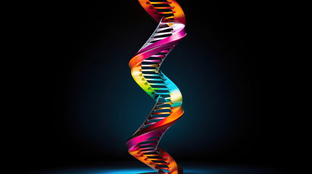 Stunning digital representation of a DNA helix showcasing intricate details and vibrant colors, set against a dark background for scientific use.