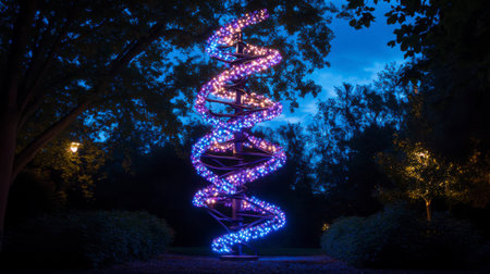 Night scene of a tall, illuminated spiral sculpture resembling a DNA double helix, set against a backdrop of trees and a twilight sky. The sculpture is primarily purple and pink with blue accents.