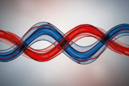 Intertwined red and blue glass-like tubes visualizing blood circulation and cardiovascular connection, modern scientific illustration of human anatomy and health flow.