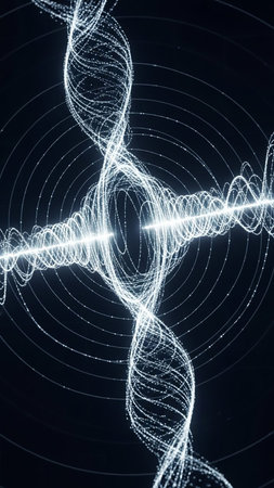 A glowing white abstract DNA helix intertwined with a sound wave pulses against a dark background with concentric circles.