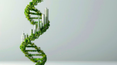 This image illustrates a green DNA helix combined with urban buildings, symbolizing the fusion of nature and architecture in a sustainable future.