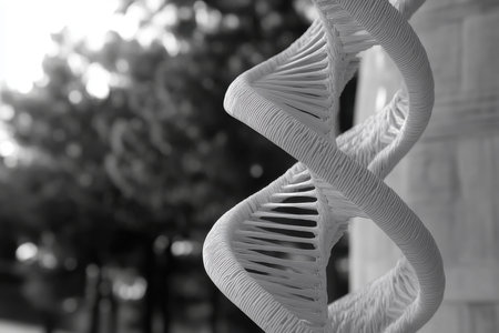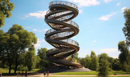 A contemporary sculpture resembling double helixes stands prominently outdoors, contrasting with softly blurred trees in the background, showcasing the intersection of art and science.
