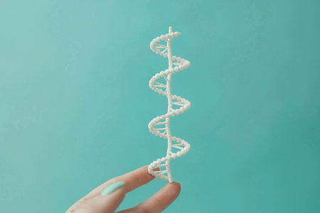 A hand holding a white DNA helix model against a soft turquoise background