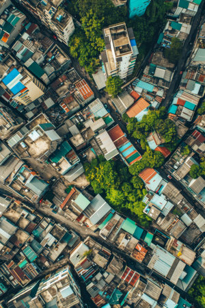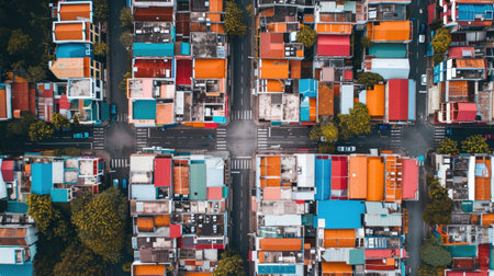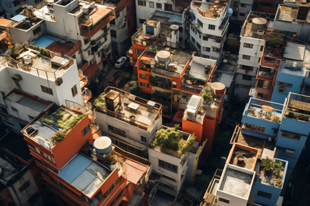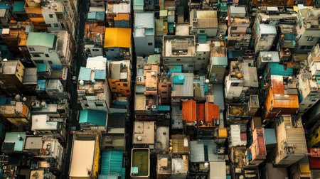 A striking aerial view showcasing a colorful array of rooftops in a densely populated urban environment, highlighting the unique architectural details and vibrant city life.