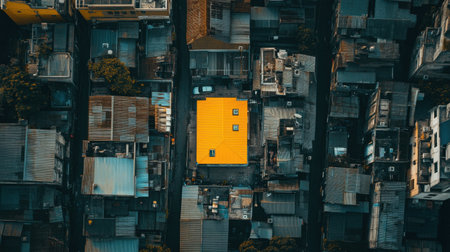 Aerial shot of a yellow house amidst dark buildings, highlighting individuality and making a bold visual statement
