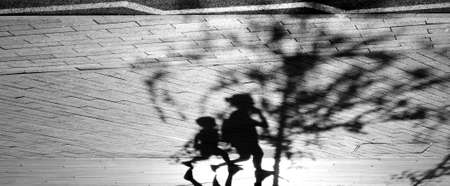 Blurry shadow silhouette of a boy and a woman walking under a young tree in pedestrian city zone in summer