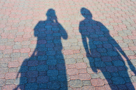 Shadows of people on ground. Couple in love walking in nature on sunny day