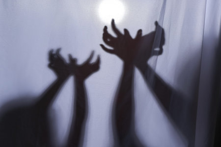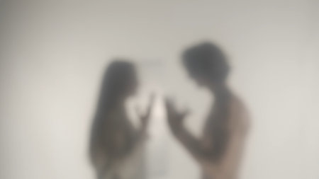 Silhouette of a quarreling couple behind a frosted glass or curtain. A woman and a man are quarreling and emotionally gesticulating with their hands.