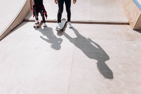 Father and his little son dressed in the casual clothes ride skateboards in a skate park with slides at the sunny day