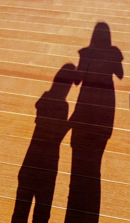 Shadow of mother and son on sunny pavement, Bergen, Norway