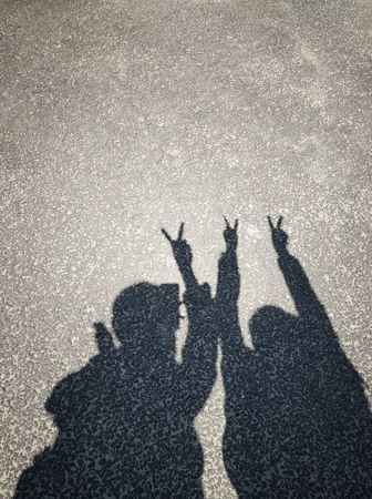Teenager boy's body profiles and hands signals shadow on yellow textured wall with attitude abstract message.