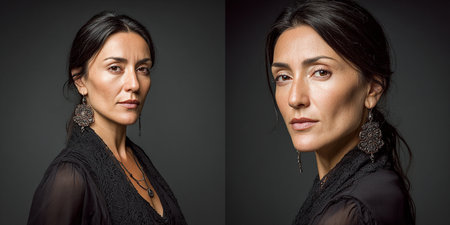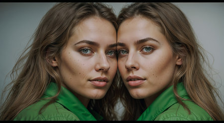 The image depicts two halves of womens faces merged together, showcasing a unique split visual, A face that is split down the middle, showing two different expressions