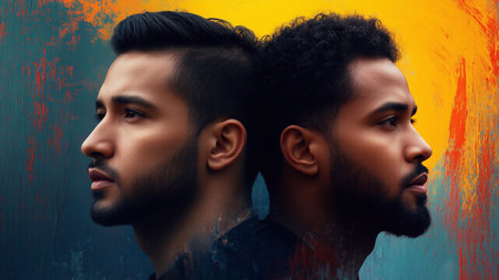 Artistic portrait of two men from different cultural backgrounds, positioned with bold, colorful textures behind them. A blend of tradition and modernity.