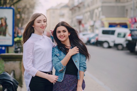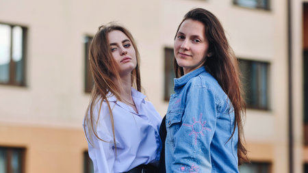 Street photo of attractive girlfriends at sunset, posing on camera, wearing casual clothes. Stylish girlfriends are standing outside and looking at the camera with a serious face. Walk with girlfriend