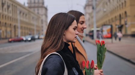 Two joyful friends in a jacket and coat are walking around the city with tulips.