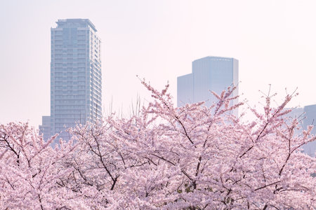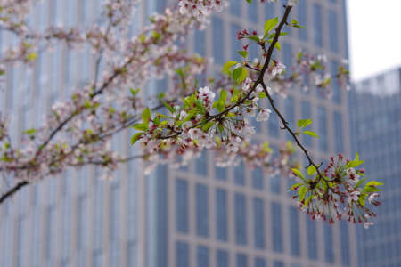Petals from cherry sakura tree in bloom with multiple apartments buildings in background exclusive and fresh real estate concept