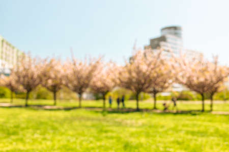 Vancouver, BC, Canada-March 31 2021: David Lam Park in springtime season. Skyscrapers and Cherry blossoms. Cherry trees flowers in full bloom.