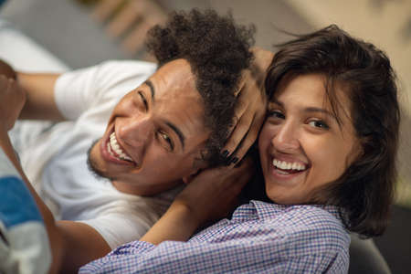 Cheerful young woman laughing and flirting with a college man. Diverse friends hanging out and sitting together in the living room