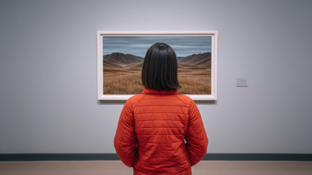 A woman in a red jacket stands in front of a striking landscape artwork in a contemporary art gallery, reflecting on its beauty and meaning.