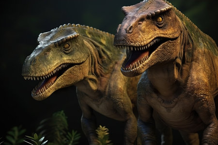 Amazing and photorealistic dinosaurs. Jurassic period. Gigantic reptile. Close up view. Beautiful and scary dinosaurus. Dangerous dino. Generative AI.