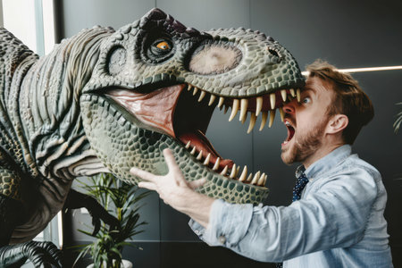 A man is enthusiastically engaging with a life-sized dinosaur model, dramatically mimicking a roar while reaching towards its open mouth. The scene is set in a contemporary indoor environment filled with lush plants and sleek furnishings.