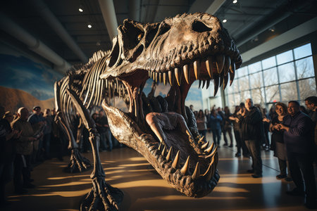 Crowds observe a large dinosaur skeleton exhibit at a museum.