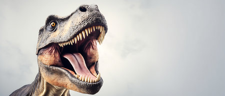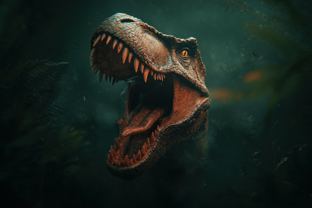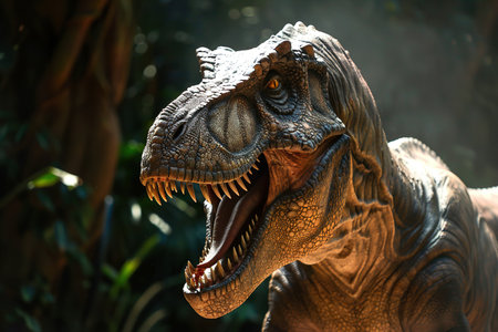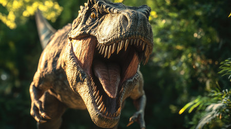 Close-up of a roaring T-rex, with its powerful jaws open, ready to strike, exemplifying the ferocity of the dinosaur era.