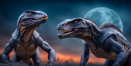 Ferocious Velociraptors under Moonlight: Jurassic Predators in Dramatic Night Scene