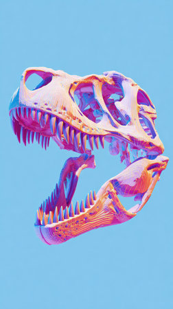 A vibrant illustration of a dinosaur skull against a bright blue backdrop, showcasing the skeletal structure with vivid colors.