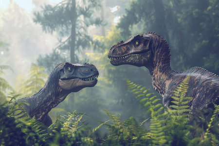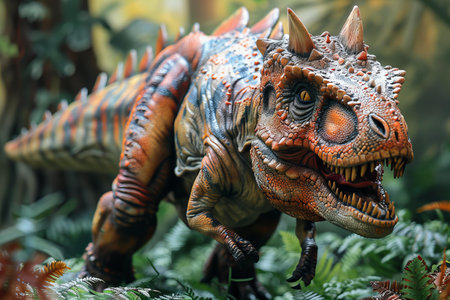 Dynamic dinosaur model captures attention in a vibrant jungle setting, highlighting details and colors that evoke a sense of adventure and imagination.