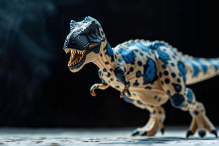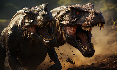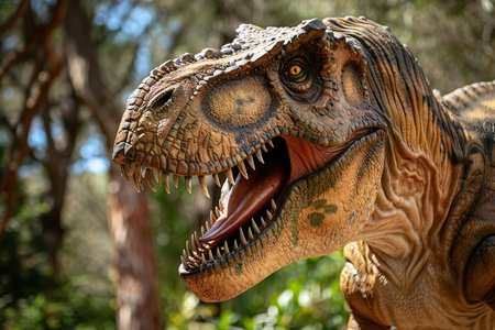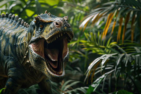The model of a predatory dinosaur has a large, open mouth with sharp teeth. Generative AI