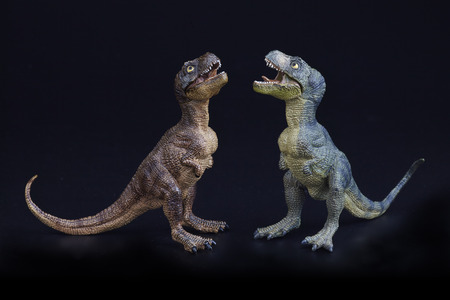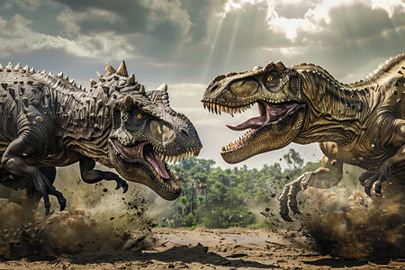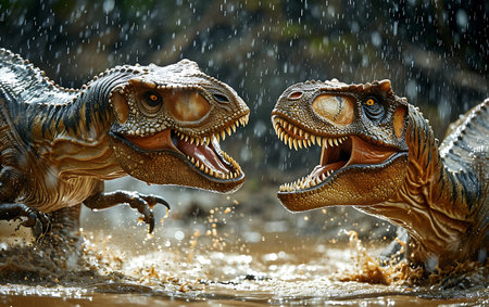 Tyrannosaurus rex (dinosaurus) fighting in the rain