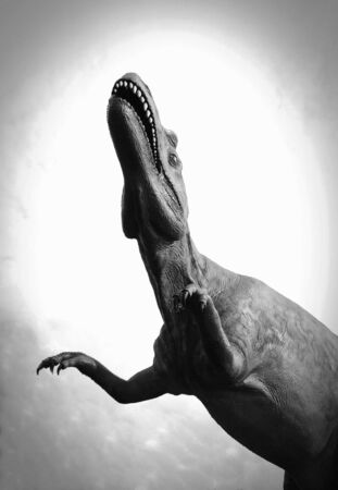 This striking image captures a T. rex in an aggressive pose, highlighting its status as a fearsome prehistoric predator.