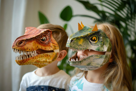 Two children wearing vibrant dinosaur masks are sharing a joyful moment while playing together indoors, fully embracing their imaginative adventure