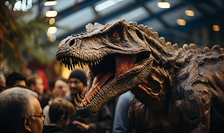 Close-up of a dinosaur surrounded by a group of people in a crowded area.