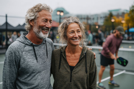 Happy couple with gray hair, dressed in comfortable athletic clothing, sharing a joyful moment on a tennis court, with players and spectators in the background